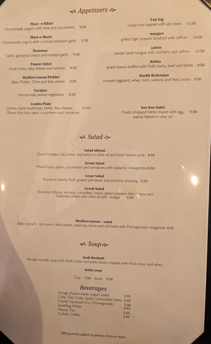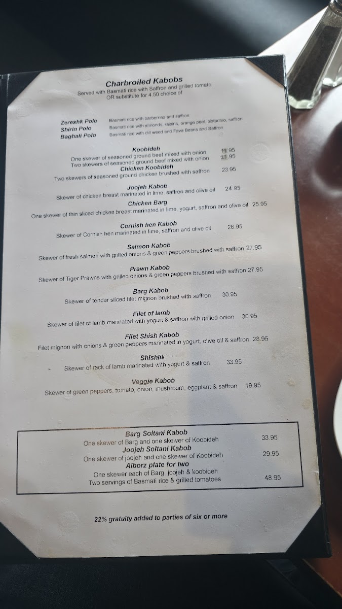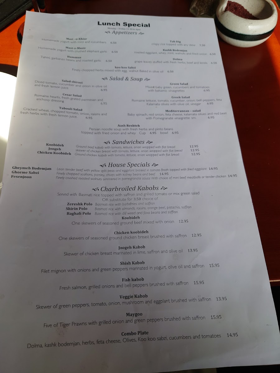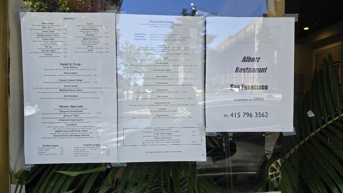 The menu at Alborz Restaurant in Berkeley offers a delightful blend of Persian and Mediterranean flavors, perfect for those seeking rich, aromatic dishes. Starting with appetizers, guests can enjoy refreshing options like Mast O Khiar and Mast O Musir, as well as heartier choices like HummusPaneer Sabzi and Mediterranean Pickles. For a warm start, the comforting Aash Resteh soup is a popular choice. Salads range from the classic Cesar Salad to the vibrant Greek Salad and Mediterranean Salad, offering something for every palate. The house specials are a highlight, featuring Gheymeh Bodemjan and Ghrome Sabzi, as well as the flavorful Khorest BodemjanFesenjoon. For a more substantial meal, Baghali Polo With Lamb Shank is a must-try. The charbroiled kabobs are a standout, with selections like Koobideh, Chicken Koobideh, and the tender Filet of Lamb. Beverages are varied, from the refreshing yogurt-based Doogh to soft drinks like Coke and Diet Coke. Overall, Alborz offers a well-rounded menu that blends traditional Persian ingredients with a welcoming, casual dining atmosphere.